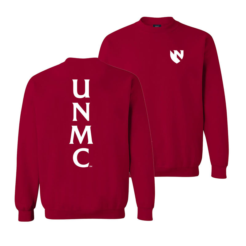 UNMC Crimson Core Crew • 7.1 oz., 60/40 cotton/polyester fleece • Rib knit neck trim, cuffs & waistband • Classic Fit • Available in sizes S through 3XL